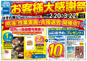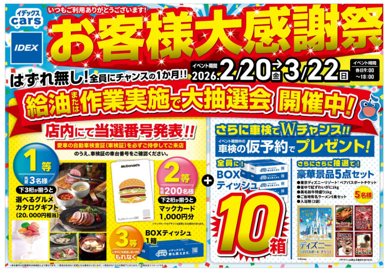 給油または作業実施していただいたお客様に、車検証に記載されている車体番号で豪華な景品が当たるかも?