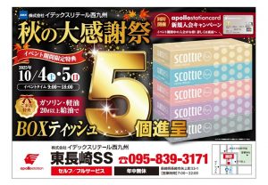 イベント期間中、ガソリン・軽油20L以上給油のお客様にBOXティッシュ5個プレゼント🎉