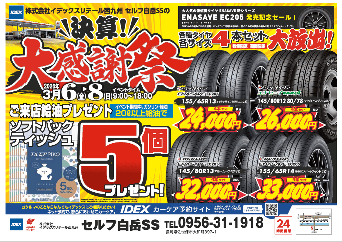 タイヤ4本ご購入でソフトパックティッシュ10個プレゼント!!