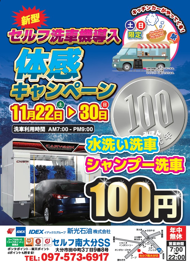 【セルフ南大分店】水洗い洗車・シャンプー洗車がなんと100円!!